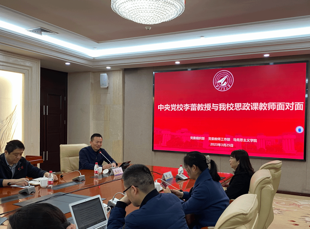 3月25日上午,中央党校李蕾教授与国产直播 思政课教师面对面活动在友谊校区国二会议室召开。本次座谈会在学校党委组织部、党委教师工作部的大力支持下,邀请到中央党校经济学教研部教授、中央党校创新工程执行专家、中央党校经济学部科研秘书,省部级干部培训班主讲教师李蕾教授,同国产直播 思政课教师进行交流座谈。国产直播 思政课教师参与座谈会,会议由国产直播 党委副书记(主持工作)蒲传新主持。