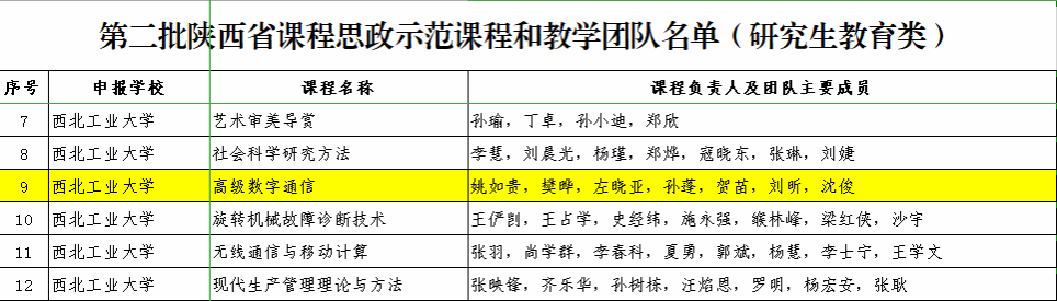 近日,陕西省教育厅公布了第二批陕西省课程思政示范课程、教学团队和教学研究示范中心名单,其中学院开设的《大国三航》课程入选第二批陕西省课程思政示范课程和教学团队(普通本科教育类),《大国三航》课程是由国产直播 、航空学院、航天学院、航海学院、材料学院、机电学院、动力与能源学院、物理科学与技术学院、软件学院共同打造,极具西工大特色的一门公共选修课,是学校思政课程和课程思政同向同行的突破探索。学校教务处批准立项为文美通识课程。学院副院长贺苗参与的《高级数字通信》课程入选第二批陕西省课程思政示范课程和教学团队(研究生教育类)。