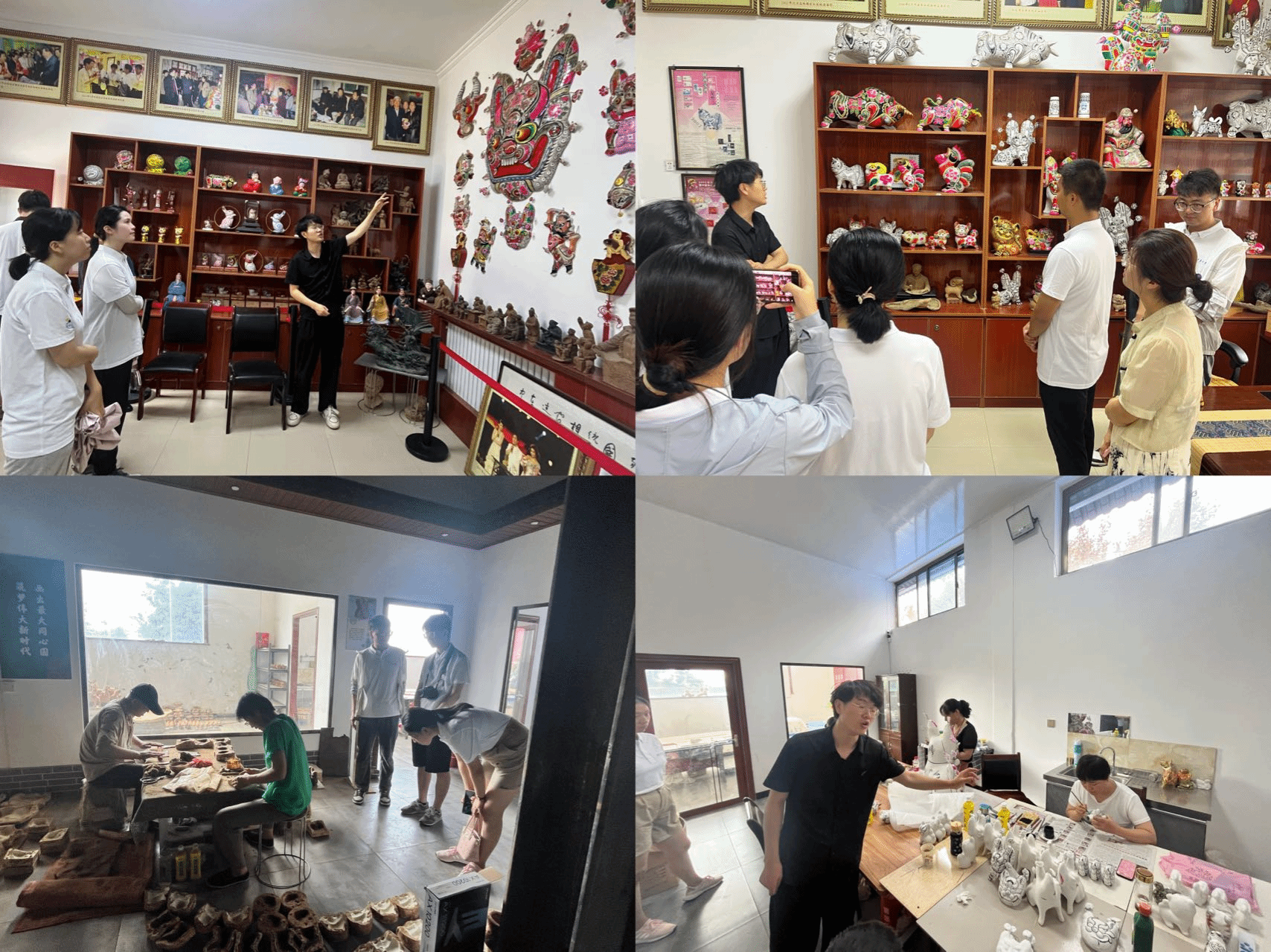 随后,实践队进入艺博园的泥塑工艺车间参观,传承人胡锦伟向大家详细介绍凤翔泥塑制作工艺,分为制模、纸筋、入泥、脱胎、挂粉、勾线、彩绘和涂漆等多个环节,艺人采用模具定型,以黑墨勾线,涂绘大红、大绿和黄色,最终产出的泥塑产品主要为泥玩具(十二生肖等)、挂片(脸谱、虎头、牛头、狮子头、麒麟送子等)、立人(民间传说及历史故事中的人物造像)等品类。凤翔泥塑的制作工艺复杂,成品精美,是我国民间美术中独具特色的精品。队员们通过现场观察凤翔泥塑的制备工艺与色彩成形,感受泥塑艺术的质朴豪放和粗中有细,体会民间艺人热爱劳动与对美好生活的追求。
